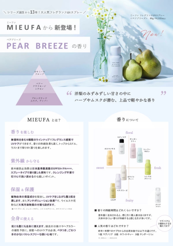ミーファ(ペアブリーズ)は、”洋梨のみずみずしい甘さの中にハーブやムスクが潜む上品で軽やかな香り”
